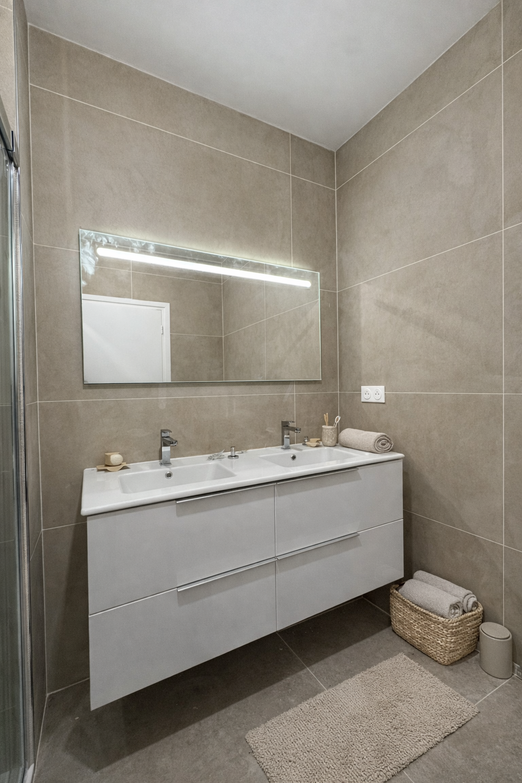 Une salle de bain totalement transformée, où chaque détail a été pensé pour allier confort, esthétique et fonctionnalité.